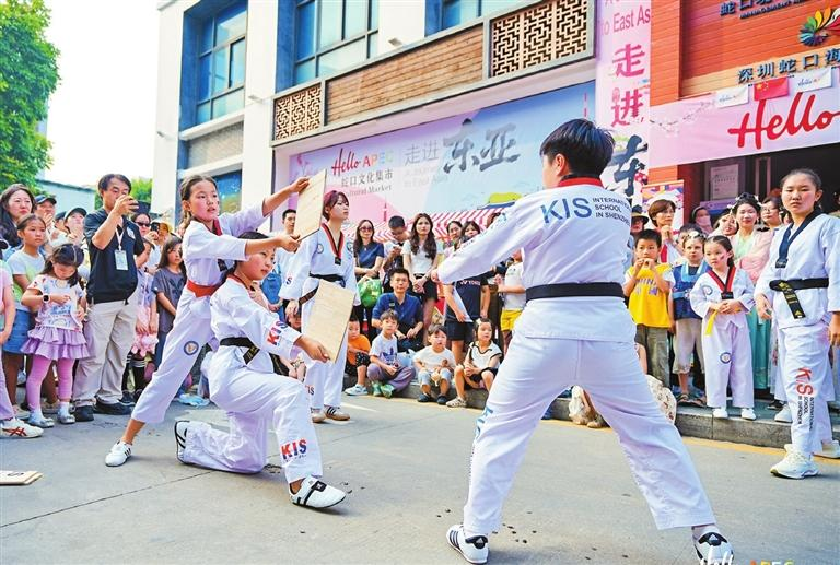 Estudantes da Escola Internacional Coreana de Shenzhen apresentam taekwondo durante a segunda edição da série de mercados culturais “Hello APEC” em Shekou, realizada no domingo. Fotos: Shekou MSCE